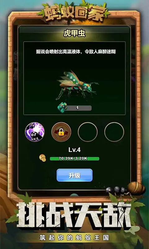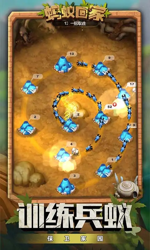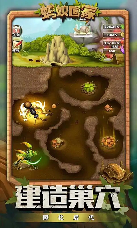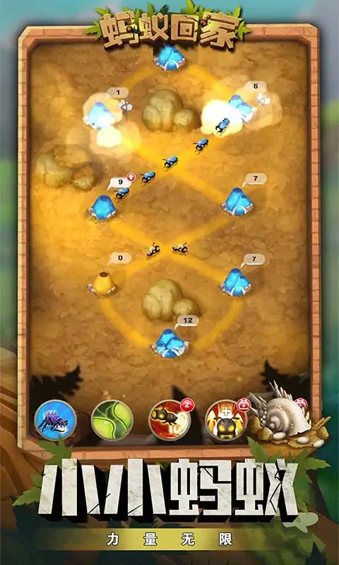大家都爱玩的蚂蚁题材休闲策略游戏--《蚂蚁回家》震撼来袭,邀您一同感受精彩的蚂蚁世界!游戏中,玩家将以上帝视角来操控蚂蚁外出觅食、收集食物资源同时可以通过孵化饲养,组建专属蚂蚁雄师,抵御天敌扩张领地,打造专属于你的地下蚂蚁王国,快来开启自然世界称霸之旅吧! 游戏特色: -探索地底发掘资源:挖掘蚁道,采集生存的必备资源,从无到有建设你的蚁国; -建设蚁巢繁荣蚁国:建设各类资源采集地,为蚁巢发展提供巨大容量的存储仓库; --荒野遇敌策略制胜:与各类昆虫作斗争,让你体验到小蚂蚁的大力量!