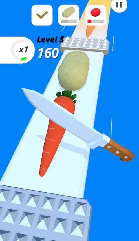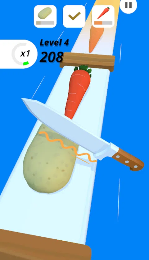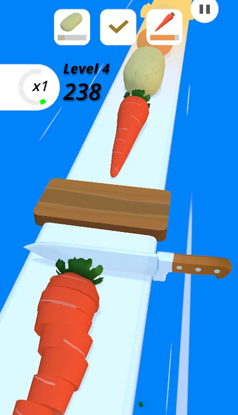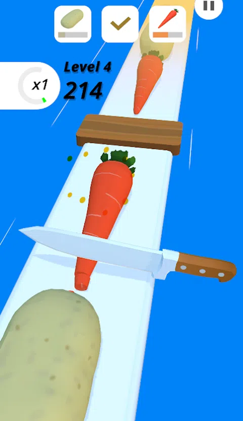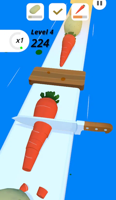 上瘾的游戏切成薄片。玩起来很有趣,而且易于控制。切碎蔬菜和水果以完成水平。您可以使用在游戏中收集的硬币在商店中购买不同类型的刀