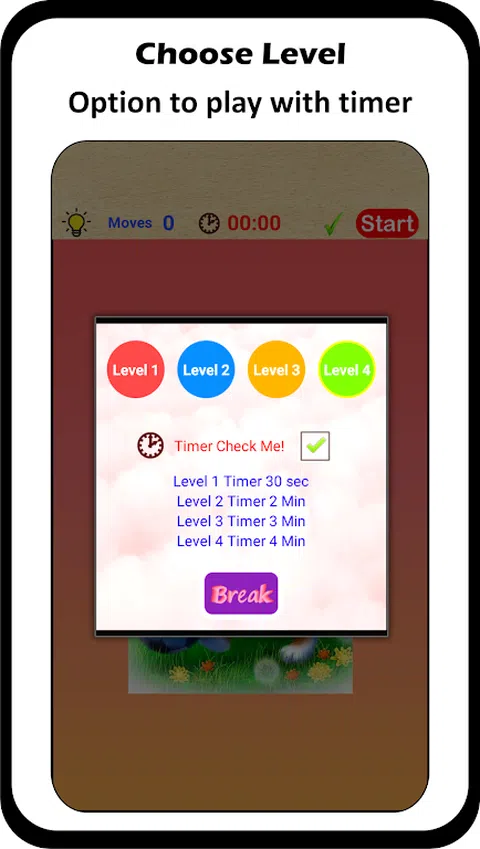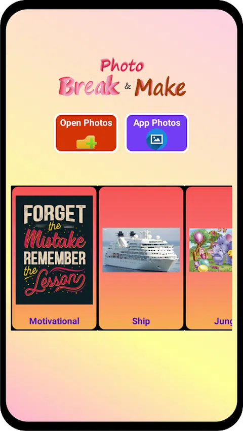 照片/图像是我们生活中不可或缺的一部分。我们周围有很多图像。 图像会给我们的记忆留下印象,因此是记忆某些东西的好来源。 Photo Puzzle是一款动摇脑细胞的益智游戏。该游戏是关于将照片分解成块并组装这些块以再次制作照片。 特征: 1)播放无限图像,如下载、点击的照片、whatsapp 图像、屏幕截图等。 2)通过解决难题并根据使用提示的次数获得星星来测试您的记忆力。 3) 适合初学者/儿童的学习应用程序—他们可以玩字母、数字、颜色等。 4)选择玩定时器。 5) 基于照片大小和屏幕分辨率(纵向和横向)的游戏。 6) 破损照片的网格尺寸—3X2、5X3、6X4、3X3、4X4、5X5、6X6、7X5。 7)更少的空间:下载/单击照片 -> 打破它 -> 制作它 -> 删除它。 8) 出色的声音和动画效果。 9) 检查块的位置。 怎么玩: 1) 从应用程序默认图像中选择一张照片,或打开设备的图像文件夹并从不同文件夹(下载、相机、屏幕截图、whatsapp 图像等)中选择照片。 2)选择级别和计时器(可选),然后打破图像。 3)触摸一个块(块开始动画)将其移动到您想要的位置 - 这两个块将交换它们的位置。 4)继续改变块的位置,直到制作出原始照片。 5)如果触摸的块不移动,则再次触摸同一块以使其保持在同一位置。 6)通过点击绿色刻度线检查块的位置