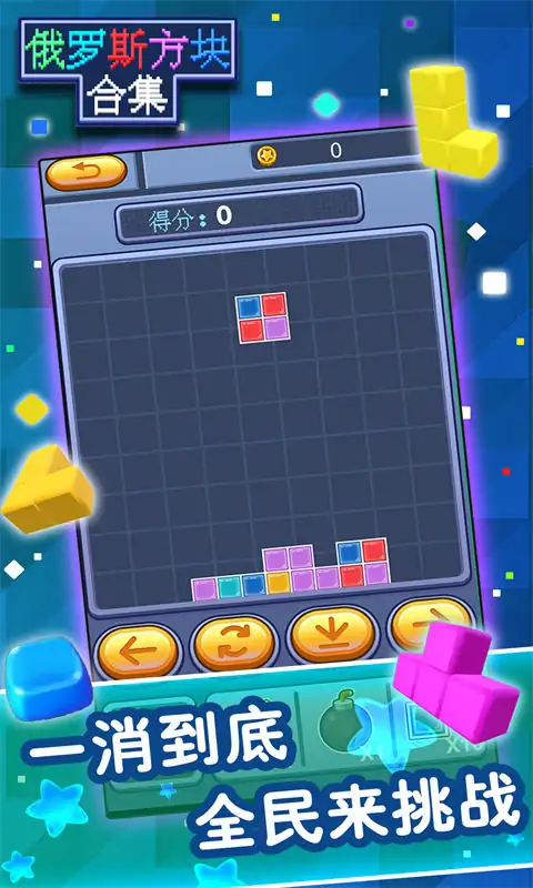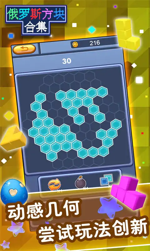 传统“俄罗斯“消除玩法,使用虚拟按键控制方块的变形与下落,消除的行数越多,得分越高。六角方块小游戏,百变方块,经典消除.