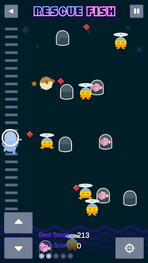 《救鱼》是一款移动2D休闲射击游戏。 一个脾气暴躁的外星人正试图通过从天上掉下一个胶囊来抓鱼。 射击坏外星人并拯救鱼