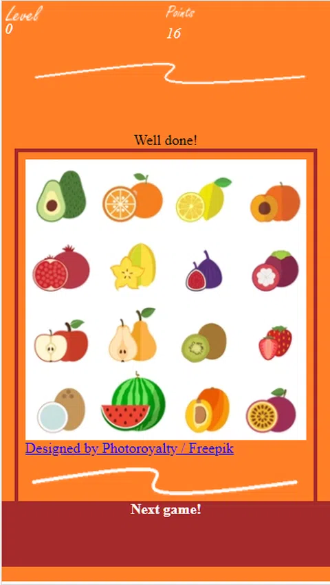 每天使用 Memory Fruits 训练您的记忆力。游戏有15个难度级别,解决游戏级别的限制时间。 Memories fruits 是一个 HTML 应用程序,每天都在改进,用户无需更新应用程序即可从改进中受益。 游戏提供三个主题: - 水果 - 美国总统 - 几何形状 每月添加新主题以保持用户的兴趣。 每天训练你的大脑