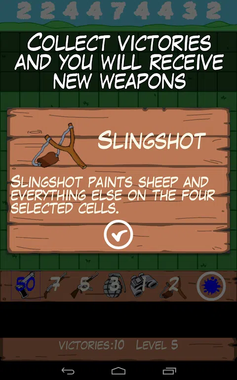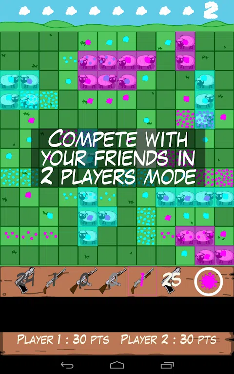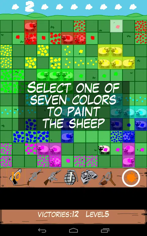 Painted Sheep 是一款基于战舰游戏(或战舰)的原理,带有一点扫雷游戏的羊在田野里的彩弹游戏。 目标很简单:隐藏 32 只羊,在 144 个单元格的区域中分成 2 到 8 只一组。成为最聪明的人,从可用的武器中选择正确的油漆武器,选择一个单元格,射击,然后再做一次,以发现 9 组绵羊。云可以帮助你。警告,您的拍摄数量有限!当羊都充满油漆时,游戏获胜。 在您的胜利过程中,您的等级会不断提升,每 5 个等级您将获得新武器 更有效,但同时你会失去宝贵的弹药。 当你发现那些小绵羊时,它们并没有奔跑或飞行。 Painted Sheep中的绵羊只是喜欢躲起来的可爱小绵羊,是的。您不必撞到它们,只需用您最喜欢的颜色涂上它们,不要放弃,直到您找到它们,使用显示它们编号的云。 游戏内容: - 5 种油漆武器 - 6 种特殊的油漆武器可供解锁 - 高达 500 胜的战役模式 - 对战模式中的 2 名玩家 - 解锁成就 - 基于胜利次数的排名 - 7 种颜色的油漆可供选择 - 3个难度级别 - 许多不同颜色的羊 - 适合所有年龄段的游戏 厌倦了所有这些克隆和山寨游戏? 尝试原创游戏,尝试画羊