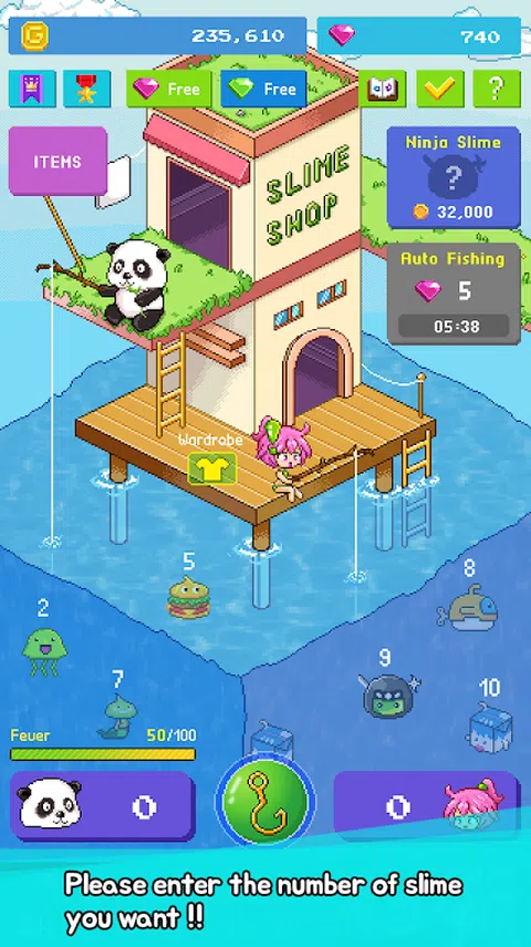史莱姆生活在水中~ ?! 如何捕捉水中的史莱姆?你必须钓鱼! 那钓鱼怎么样? 按下按钮的次数与史莱姆头上写的数字相同。 按钓鱼按钮(绿色圆圈)〜! 如果你抓住史莱姆,就会创造黄金。用黄金升级史莱姆。 请尝试不断出现新的史莱姆。 [教程] 1.按下面的紫色按钮输入数字 2.匹配您想要捕捉的史莱姆数量,然后按“钓鱼按钮(绿色圆圈)”开始钓鱼! 3.抓住史莱姆,让史莱姆升级为黄金。(右上角按钮) 一种新的史莱姆出现。 4.在狂热模式下触摸史莱姆。您可以轻松捕捉大量史莱姆。 5.升级“物品”菜单中的各种物品,使游戏进度更容易。 [提醒] “钓鱼史莱姆”仅在设备内保存游戏数据。 小心