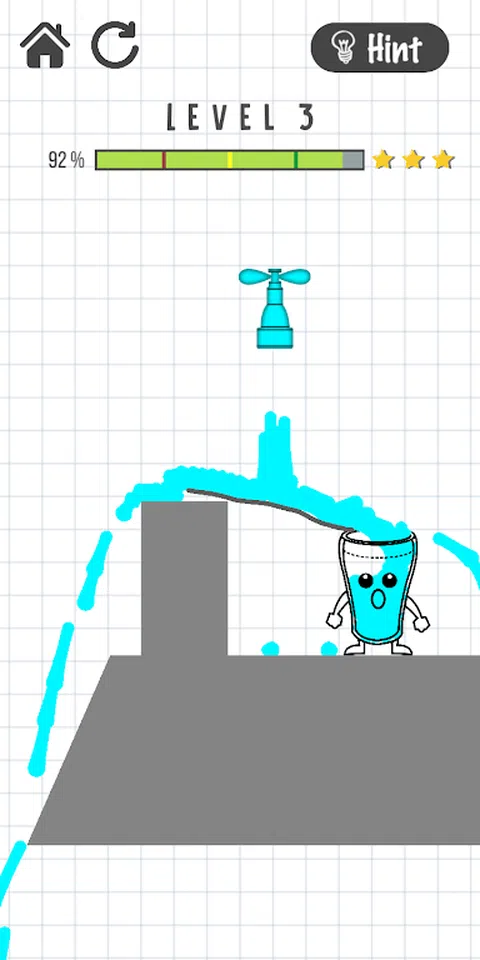 Happy Together - Glass vs Water 是一款有趣的街机游戏,其中一个悲伤的空杯子需要装满水才能让它再次快乐。游戏将从高处的水体开始,使用您的创造性绘画技巧,您必须绘制一条让水流过的路径,以尝试将水填满玻璃杯