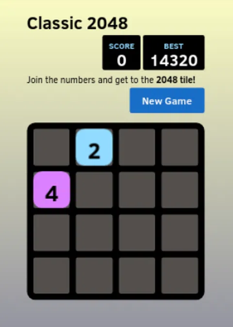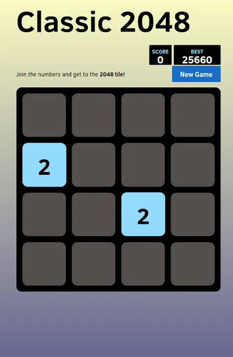 经典 - 2048 - 一个令人上瘾的益智游戏和一个很好的时间杀手。 怎么玩 向左、向右、向上或向下滑动以移动图块。当两个具有相同数字的瓷砖接触时,它们会合二为一! 例如,如果您用另外两个滑动两个,它将合并为四个。这样您就可以合并相同的数字。继续合并,直到到达 2048。 你的目标是达到数字 2048 来赢得比赛,否则你就输了!一旦到达 2048,游戏将进入无尽模式。得分尽可能高。 分享您的分数截图并在 Facebook 或 twitter 上用井号标签 #classic2048 吹嘘它 负责任地享受