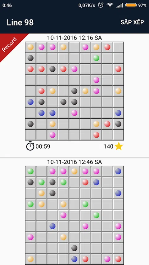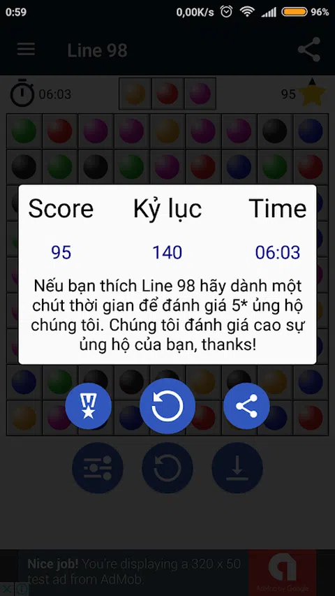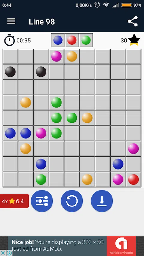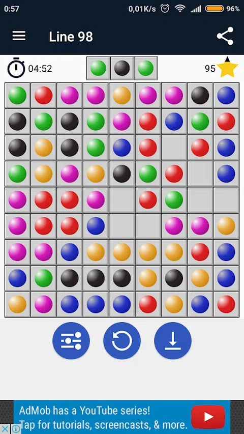 Line 98(又名 Line 98 Deluxe、Color Balls 或 Color Lines)是一款带有彩球的令人上瘾的益智游戏。 你玩过 Lines 98 或 Color Lines 吗?现在在智能手机上再次享受它。这是最有趣的经典游戏。 Lines 98 是一款非常容易上手的游戏。 怎么玩? - 将五个或更多相同颜色的球排成一行。 - 线可以是水平的、垂直的或对角线的。 - 触摸并按住球并移动到您想要的单元格。 特征: - 使用基于Line 98经典的游戏规则 - 棋盘上的 9x9 方块 - 声音开/关 - 高分信息 - 保存和加载游戏 让我们玩第98行