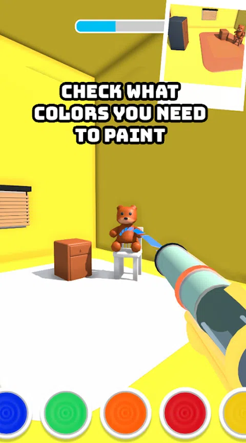 在这个益智游戏中,您的任务是在房间内绘制各种物体。目标是用颜色填充房间,但有一个问题:您只能通过从物体上射出油漆泥来为物体上色。您需要仔细计划自己的动作,以便到达房间的每个角落和缝隙,并确保每个物体都已涂漆。随着关卡的推进,房间将变得更加复杂,挑战也会增加