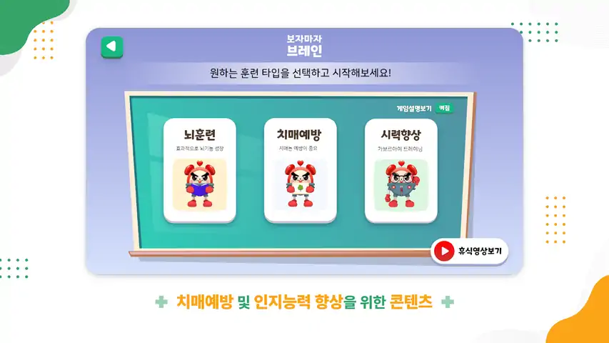 激活您疲惫的日常生活和疲惫的大脑。 - - - 各种脑力训练游戏 匹配建议的单词,计算食物的成本,用双手画不同的图等。 通过各种游戏刺激你的大脑!大脑功能的增长! 痴呆症预防游戏 看图选谚语、找迷宫、找错图、数连续数等。 痴呆症的预防比治疗更重要。让我们通过各种游戏来预防痴呆症吧! 舒缓疲惫大脑的放松视频 你的大脑也需要休息。让忙碌的大脑休息一下! 视力提升训练 让我们使用 Gabor Eye 恢复与相同的图片查找游戏退化的视力吧