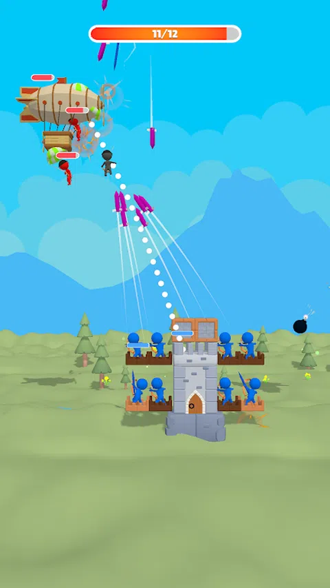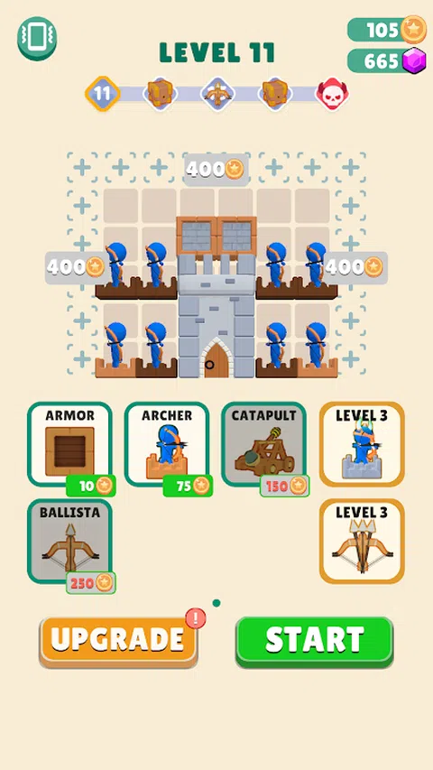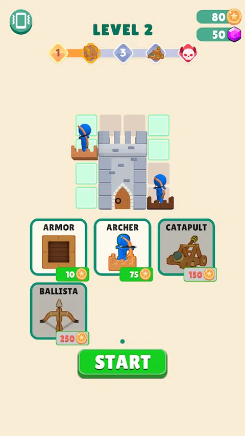 在这个游戏中,拖动塔楼将它们合并。合并后的塔楼更强大! 接下来,点击“开始”按钮,粉碎对手