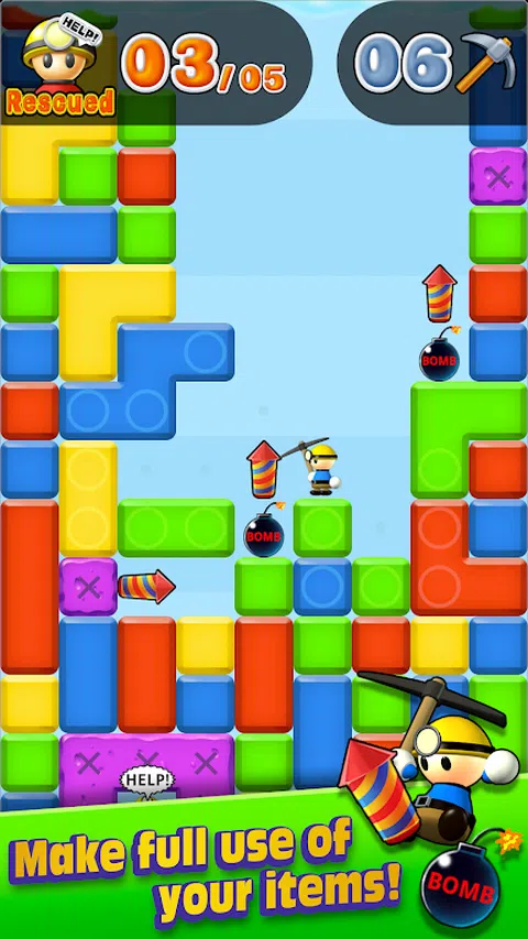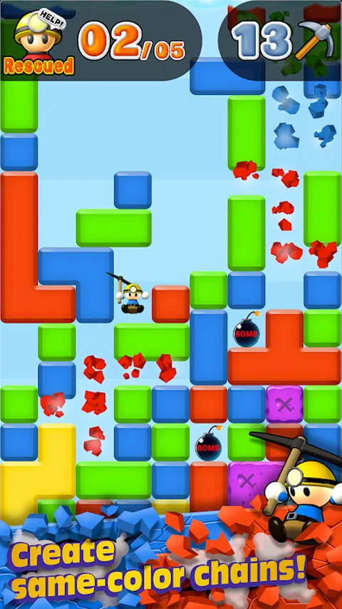 摧毁方块以深入挖掘! 这些方块构成了一个谜题—你可以通过链接相同颜色的方块来摧毁它们! 尽可能深入地挖掘,拯救被埋葬的朋友! 摧毁那些方块! 您可以使用一个垫子摧毁一个方块。战略性思考,弄清楚如何进行! 创建同色链! 将相同颜色的方块连接在一起,以连锁方式将其摧毁! 帮助您埋葬的朋友! 点击您的朋友以完成救援并成为英雄! 充分利用您的物品! 使用您认为对自己有利的物品。 密切关注你还剩下多少松茸,挖、挖、挖
