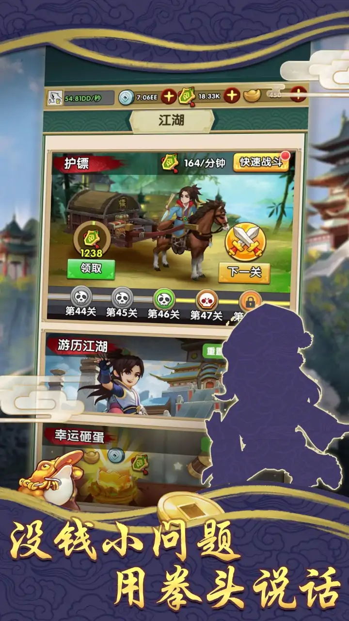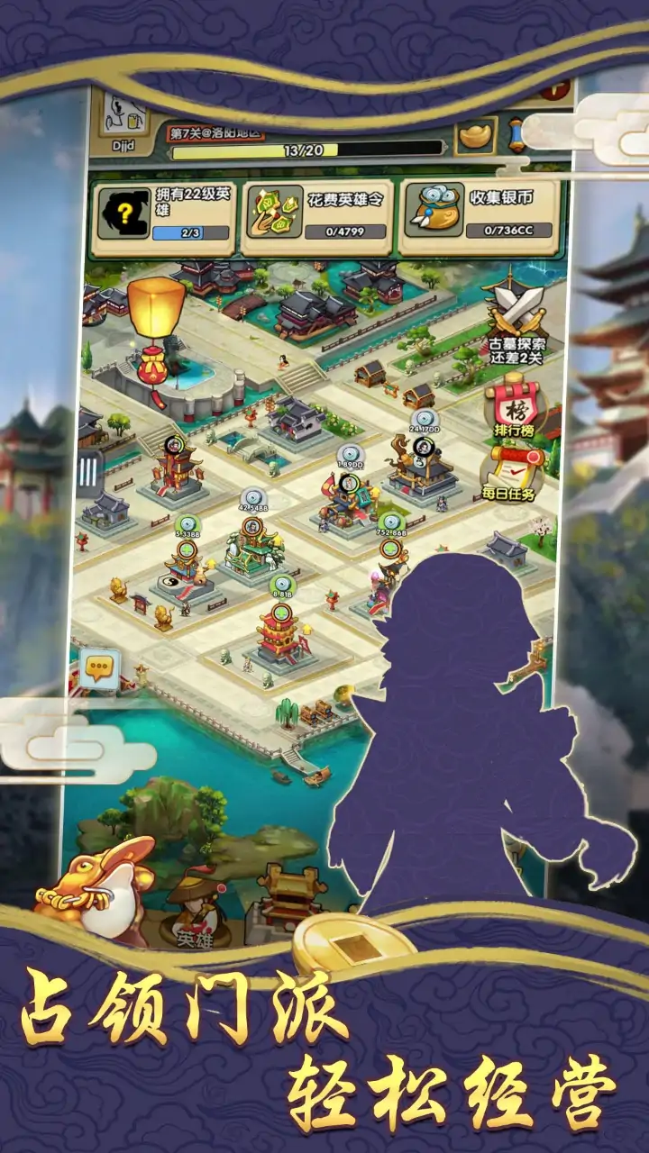 这是一款结合了模拟经营+放置战斗的武侠主题游戏。游戏中的可以抽取属于自己的英雄,他们既可以帮你经营门派,也可以为你出战四方,让你体验到一把躺着把钱赚了的富二代。