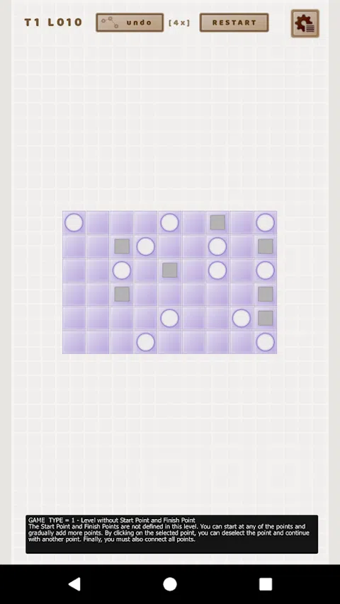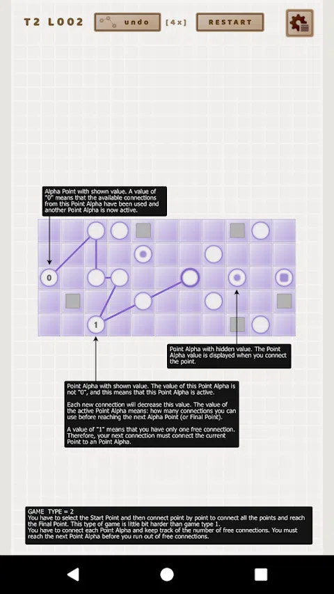 One Line (OLine) 是一款简单的益智游戏。在这个游戏中,您可以训练自己的思维和想象力。任务是连接所有点,以使各个连接不交叉或穿过其他点或石头。 游戏没有时间限制。如果您到了不知道如何继续的地步,可以重新启动关卡并尝试再次玩。 您可以执行有限数量的撤消步骤来纠正最后一个错误连接之一。 在某些级别上连接点的正确方法可能不止一种。 游戏提供 3 种游戏类型: 1: 在开始时,您会看到一个点。当您选择它时,您将看到其他点以及一个作为终点(终点)的点。您必须连接所有点,以便这些点由一条线连接。您必须连接的最后一个点是标记为终点的点。 此类游戏还有第二种变体。在某些级别上,您没有定义的起点或终点。您可以选择任何点作为起点,并开始连接其他点。在此变体中,您可以通过单击来取消选择当前选定的点。然后,您可以选择一个新积分并继续加入其他积分。 2: 您已指定起点和终点。然后还有更多的点阿尔法。当你连接一个阿尔法点时,上面会出现一个数字。这个数字定义了您在到达下一个阿尔法点之前拥有的连接数。如果数字“1”在该点上,则意味着您必须在下一轮中连接一个阿尔法点。 3: 您尚未定义起点或终点。您可以从所需的点开始。但是,您连接的点将沿连接线的方向移动到最后一个空单元格(另一个点、石头或现有连接可能会阻止点的移动)。您可以通过单击取消当前选定的点,然后继续另一个点