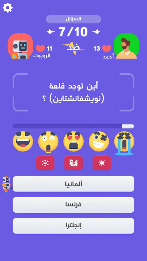 一个有趣的文化竞赛,可以在两个人之间进行(在线)。或者(离线)一个人对战机器人。 一款阿拉伯语信息问答游戏,可以在真人玩家之间进行网络对战,用户可以在游戏服务器(挑战服务器)内随机搜索竞争对手,或者向朋友发送邀请,与他一起挑战。 每个挑战轮显示十个问题,每个问题包含三个可能的答案。比赛在玩家之间进行,谁能正确快速地回答问题,谁就可以继续下一题并获得积分