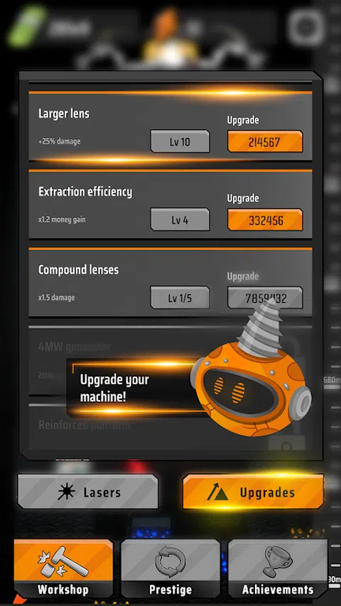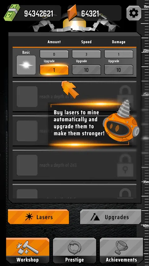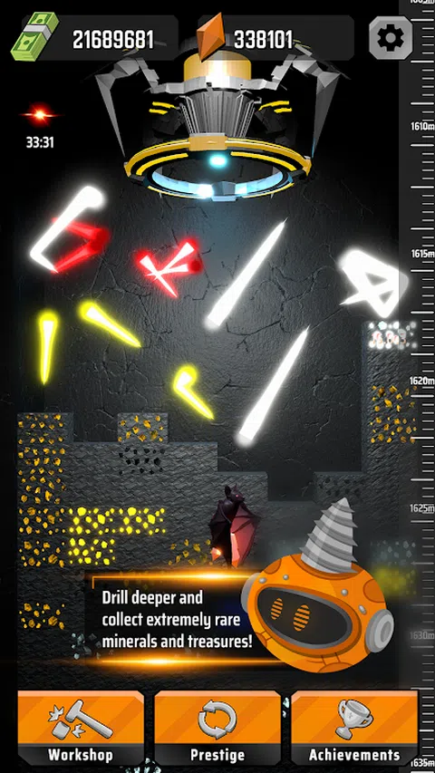 在“Laser Inc. Idle Miner”中控制强大的激光钻孔机,开始在这款令人兴奋的采矿游戏中挖掘财富 - 非常适合模拟游戏和挖掘游戏的粉丝!在这款手机游戏中,您将探索一个完全自动化的采矿世界,您必须尽可能深入地挖掘才能发家致富。 借助触手可及的可靠激光钻,您可以购买和升级它以使其更加强大。当您深入挖掘时,您会遇到新技术,可以帮助您更有效地开采并赚取更多的钱。 但请注意 - 你走得越深,游戏就变得越具有挑战性。要想成功,您需要获得强大的升级,这需要您从头开始重建您的矿工。 这款采矿游戏具有令人惊叹的 3D 图形和模拟物理效果,让您沉浸在美丽而逼真的环境中。所以,准备好在这款激动人心的激光游戏中深入挖掘并发财致富吧