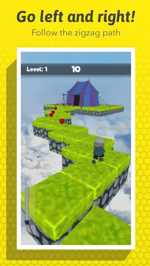 这个曲折的游戏在以最引人入胜的方式设计的云层中穿行。随着你的速度赛跑者在冰冻的土地和空气中奔跑,当你为通往城堡、通往休息的道路铺平道路时,你会收集心。有了这些知识在你的手掌,你会尽量不让你的腹部厚厚的字符在云中翻滚不休。 特征: • 彩色3D 图形。 • 主角的动作流畅流畅。 • 您只需按所需方向点击屏幕。 • 多层次的无尽挑战。 • 在Zig Zag 类型的道路上挑战您。 • 与所有安卓设备兼容。 • ZigZag 挑战既有趣又免费。 怎么玩: 城堡或帐篷是你的避风港。您会或将无法找到通往它的路吗?最终找到和平对你来说有多难?锯齿形找出答案