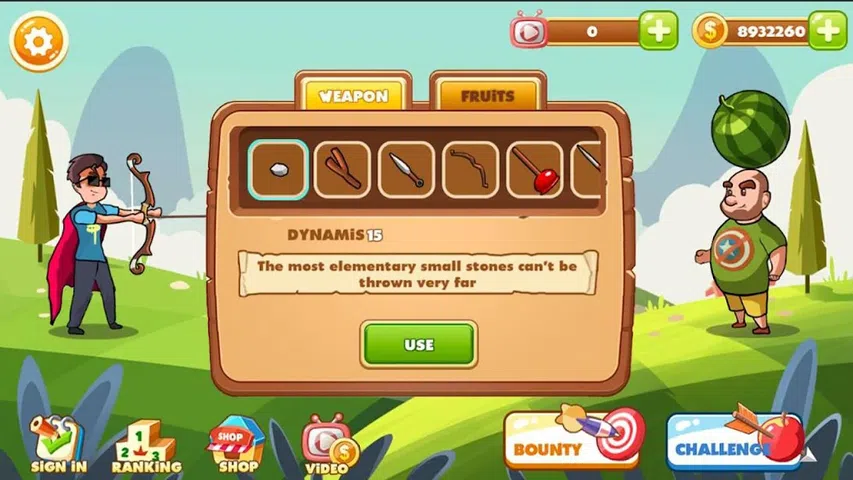 ● 您可以通过射击果树来练习射击技巧并获得金币。 ● 您可以通过金币购买不同的射击道具,例如:石头、忍者飞镖、手里剑、强力弓、弹弓等。 ● 可以通过金币购买不同的水果,甚至可以让你的伴侣头上戴个大西瓜 来吧
