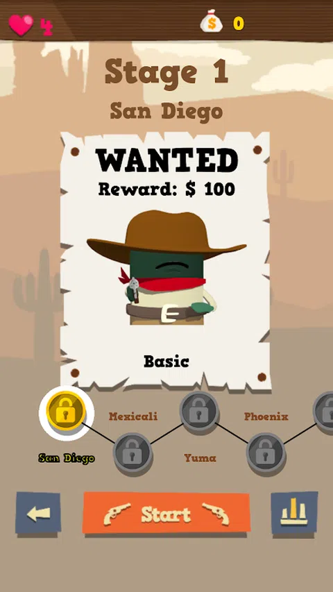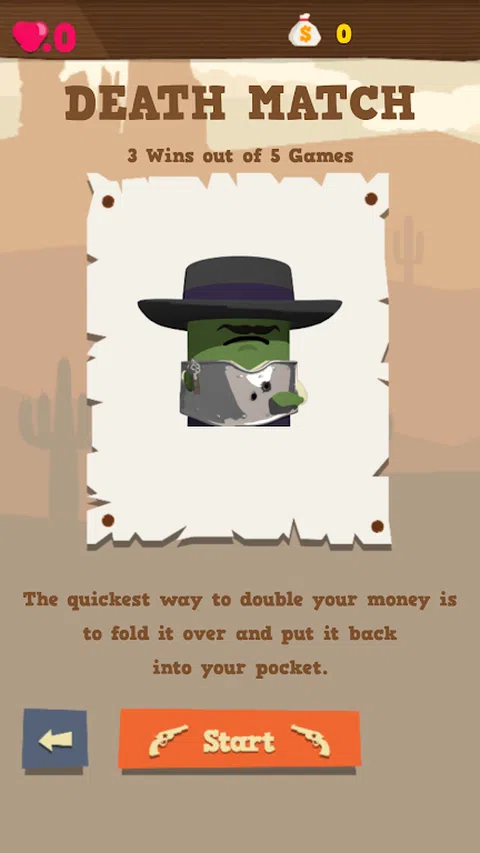 一秒决斗 来自Team Bunkiten 的令人上瘾的西部枪战游戏。 装上你的枪,并试图超越你的坏人。 在这个发自内心的游戏中,三十轮戏剧性的决斗等待着你。 等待 3 秒,当倒计时达到“0”时,尽可能快速准确地射击对手。 首先射击你的敌人,否则你会被枪杀。 关键是响应速度和手指敲击的准确性。 赢得每一场决斗,维护和平与秩序。 成为狂野西部的英雄王牌射手! 游戏特色: - 一键游戏 - 有史以来最快的游戏。 - 易玩但深刻而有趣。 - 快节奏的决斗和冒险任务 - 响应速度和手指敲击的准确性至关重要。 - 包括狙击手和双手枪老板在内的各种敌人。 - 30 个动态阶段:每一秒都很重要 - 3 种游戏模式:1P 故事模式、1P 死亡竞赛、2P 死亡竞赛 - 3 个奖励阶段:鸭子、目标和熊 - 支持 2 人对决 - 与朋友进行一对一的枪战! - 免费玩,也可以离线玩! 谢谢