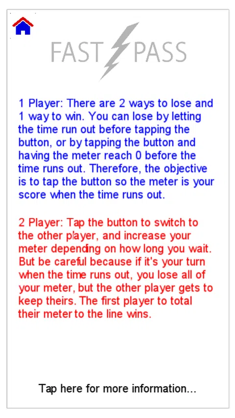 带上你的朋友! 找你的邻居! 找任何人! 在史诗般的快速通行证游戏中与您的朋友战斗,您可以在其中与对手赌时间,但请注意不要在时间用完时轮到您。在回合结束前,您将有 10 到 30 秒的随机时间,因此请调整自己的节奏,并明智地点击。您等待点击的时间越长,您获得的积分就越多。此外,回合越晚,您可以获得的积分就越多。如果时间用完轮到你,你就输了。这意味着您将失去该轮获得的所有积分,但其他玩家可以保留所有积分。第一个总米达到终点线的玩家获胜! 您也可以在悬疑的 1 玩家模式中自己玩。您将有 5 到 20 秒的时间来点击按钮,但与 2 人模式不同的是,您的目标是尽可能地等待以获得最多的分数。仪表会上升,直到您点击按钮。如果在您点击之前时间用完,您将失去生命。如果您单击按钮,仪表会下降,如果它达到 0,您也会失去生命。因此,当时间停止并且仪表处于最高点时,尽可能晚地点击以获得最多的点数。您将有 3 条生命来积累尽可能多的积分。 祝你好运