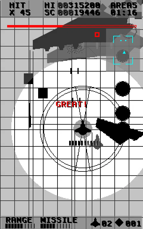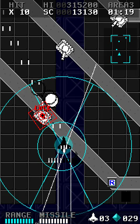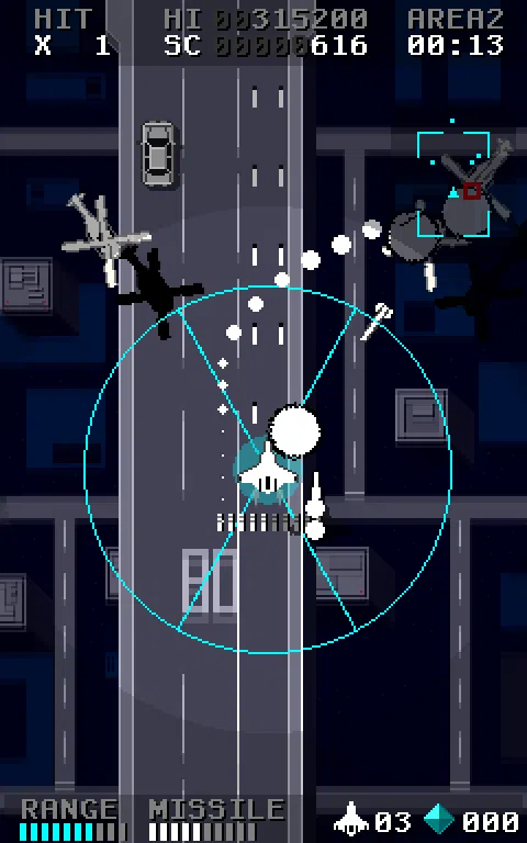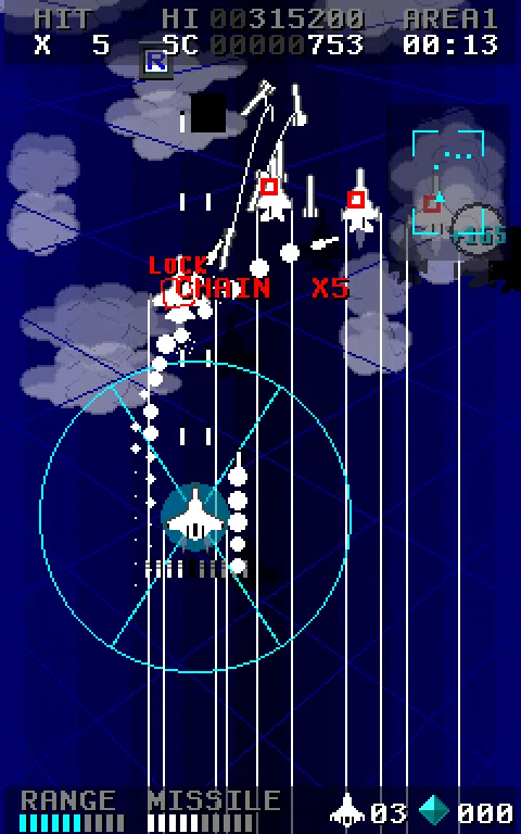 这是一个垂直滚动射击游戏。 你可以操作实现锁定导弹的战斗机导弹舞者。 光标锁定显示在飞机上方。 在推动镜头时,光标放大。 您可以通过将光标与敌人进行匹配来锁定。 通过接通电源项目,光标范围和锁定数量增加。 由于这是免费版,可播放的区域是有限的。 如果你喜欢这个游戏,请下载完整版