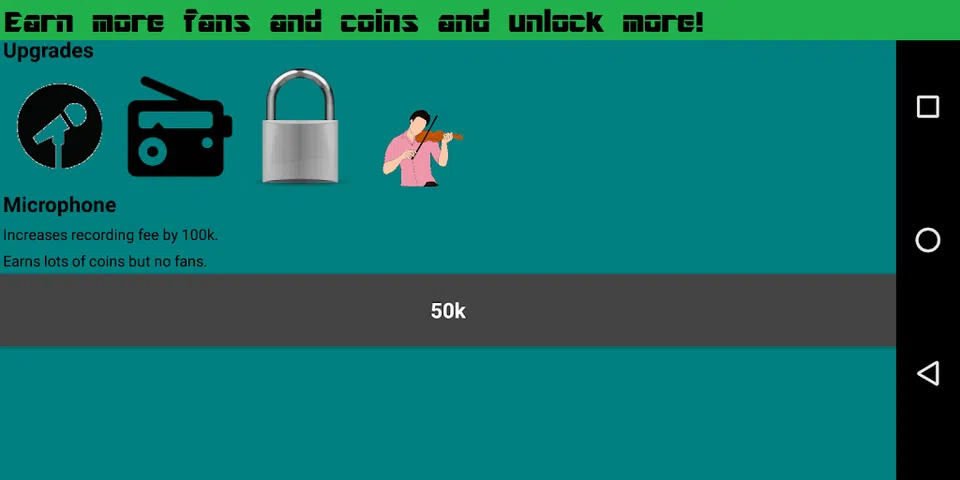 创建和发布歌曲,做现场音乐会,但最重要的是成名并赚取数百万的硬币! 要创建和发布歌曲: (也在教程中解释) 1.选择歌曲标题。 2.选择是否要唱你的歌。 3.唱你的歌或者只输入歌词。 4.选择要发布歌曲的位置。 5.(可选)选择要宣传歌曲的位置。 6.按'发布',开始赚取数百万的硬币和粉丝