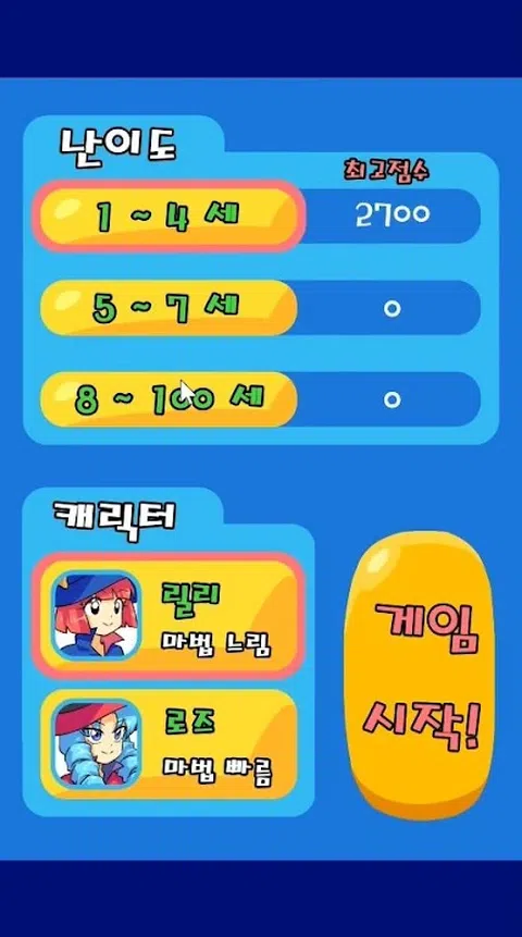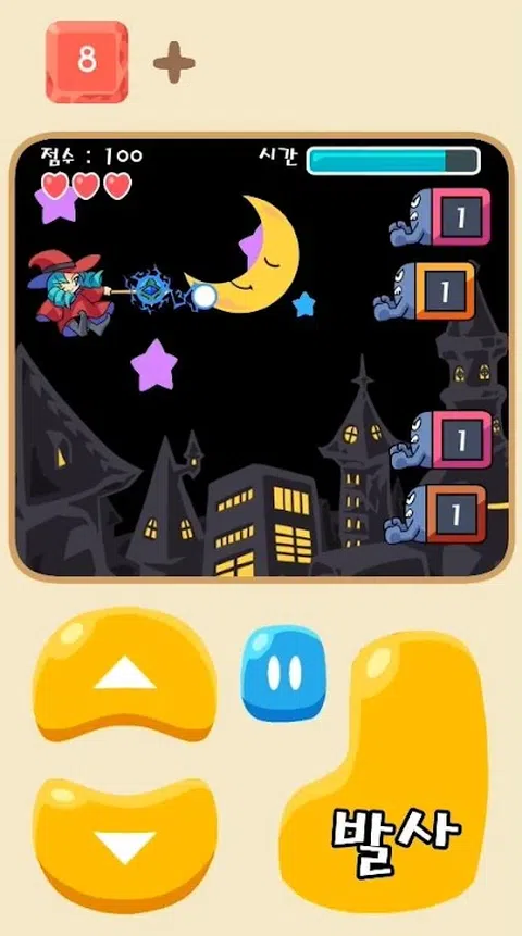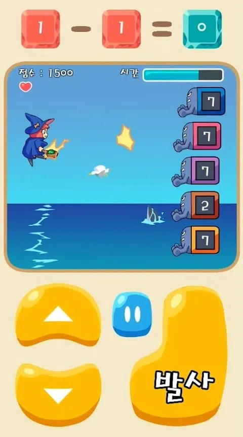 幼儿和儿童的教育游戏,魔术女巫! 可爱的女巫用魔法做加减法! 游戏特色 - 带有可爱图片和流行音乐的图形。 - 有3个难度级别和2个字符。 - 用箭头按钮上下移动,用开火按钮开火。 - 语言支持韩语和英语。 - 如果剩余时间变为 0 或您失去 3 颗心,则游戏结束。 - 当您第一次点击该框时,会出现一个加号或减号。 - 如果您点击第二个框,则会出现回显 (=) 符号。 - 如果您正确回答问题,将添加剩余时间。 - 如果问题的答案是错误的,盒子会被攻击。 游戏优势 - 当孩子自己创造和回答问题时,大脑就会发育。 - 您可以以有趣的方式学习加法和减法。 - 由于时间限制,快速做心算的能力得到了发展。 - 3 个难度级别,从学龄前儿童到成人。 - 您可以在射击和躲避的同时享受重复学习
