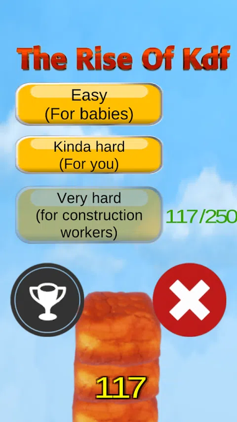 没有人知道他们真的是从哪里来的?但是,这不是什么秘密,他们来这里是为了接管在当时世界一个饿着肚子。如果这还不够,他们现在都在你的手机了。引入“崛起的KDF”;一个新的街机游戏,从字面上让你的食物玩的!是的,你的屏幕只是一个简单的点击,您最多可以在高空叠精彩片段的KDF你的心脏的内容:)但是事情远没有这么简单,如果这是任何人都可以吃干KDF!这就是为什么时间在这里很重要,尽量地将它们放置在彼此的顶部,你架了足够的积分,在排行榜的朋友和家人进行竞争,并赢得自己的TRUE KDF高手! 游戏还拥有三个难度级别“非常容易”,“均田硬”和“很辛苦”。有了这样的,所有冰雹KDF