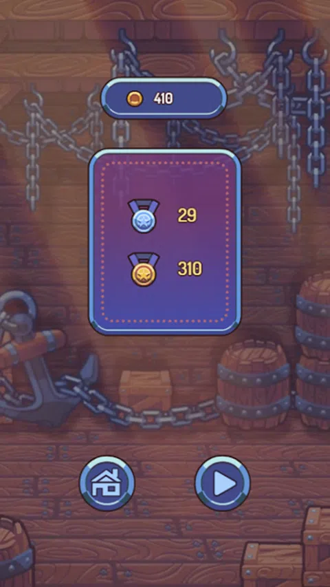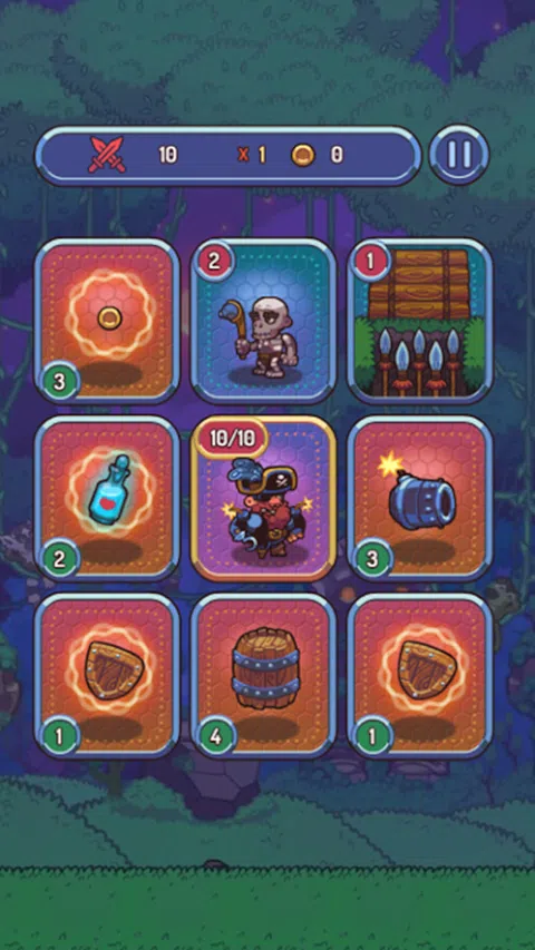 在这款流氓式纸牌游戏中,您将扮演勇敢的海盗船长,探索一个充满危险和宝藏的遥远岛屿。 规则很简单:您可以在面板上向右、向左、向上或向下移动一步,直到用完生命点数。 为了尽可能长时间地生存,您需要正确的策略并提前计划行动。 射击大炮,喝药,收集盾牌和硬币,粉碎桶时要小心,因为桶中可能包含有用和令人讨厌的惊喜。 通过完成迷你游戏击败老板来升级你的英雄并打开宝箱。 在每轮之前解锁新角色并购买助推器,这可以为您带来决定性优势