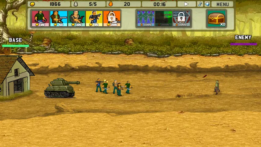 预测敌人的行动并在军营中从他那里生产士兵。 你越爱,你的对手就会越强。 制定你的策略,在车辆、士兵之间做出选择,并将它们明智地放置在战场上,击败每一个对手! 在陆军战争时代,成为最激动人心的战斗的胜利者。 控制 16 个不同的单位和不同的特殊功能来保卫你的基地并摧毁你的敌人。 在这款令人疯狂上瘾的动作/策略游戏中穿越岁月