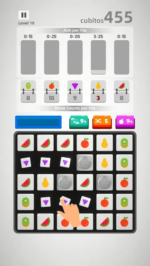 Cubitos 是一款具有重大转折的三消益智游戏。 这款独特的益智游戏通过按颜色限制移动数和按颜色匹配目标数来挑战您。 还有更多:移动次数会随着您移动的距离而减少。因此,计划您的策略以位移进行匹配。 到目前为止,Cubitos 似乎非常具有挑战性,但这款游戏的学习曲线非常好,您可以在玩游戏的过程中不断提高匹配大量立方体的能力。 您可能无法移动一种颜色,但您可以继续进行匹配以移动其他颜色。 您可以使用助推器炸开所有颜色的方块,或洗牌,或更改方块组。 游戏特色 按位移移动计数 按颜色/方块移动计数限制 按颜色/方块匹配目标 20 多个很酷的瓷砖集 炸弹助推器 洗牌助推器 更改瓷砖设置助推器 的用户交互 具有挑战性的关卡设计 无穷无尽的匹配板 在声音、触觉和视觉效果方面刺激反馈。 立即获取这款独特的三消游戏,享受数小时的脑筋急转弯挑战和无尽的乐趣