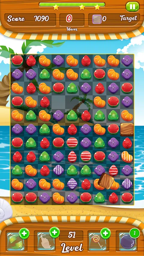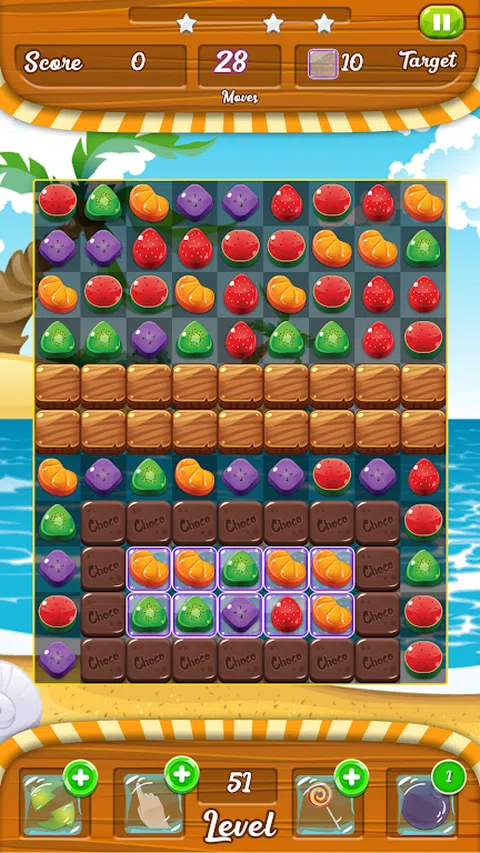 这是一款令人兴奋的三消益智游戏,带有水果物品和升级。它具有多个游戏关卡,具有各种有趣的功能,例如 块类型:每种水果项目有四种图形不同的块 流行/粉碎效果,空砖,巧克力砖,玻璃砖,牢不可破的砖,助推器图标,粉碎效果,垂直和水平粉碎效果