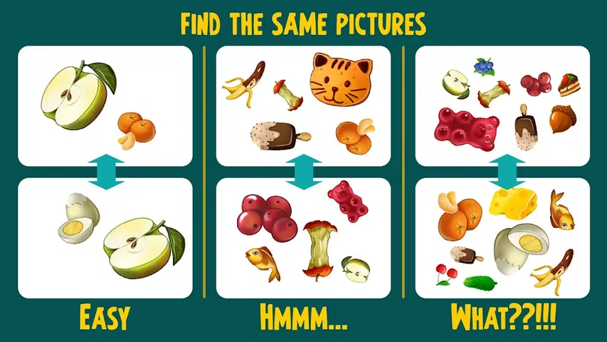 似乎比找到两张相同的图片更容易。如果图片的大小和位置相同,我们的大脑就可以轻松应对这项任务。但是如果我们只稍微旋转一张图片,那么任务就会变得更加复杂。 《The Same》是一款简单而独特的游戏,可以开发您的记忆力和智力。 两张牌有不同的对象,两张牌上只有一个对象相同。尝试找到它。你会发现这并不容易。 在这个游戏中训练你的大脑,培养你的正念。 这是免费的脑力训练器。您可以完全免费玩这款大脑训练游戏,训练您的大脑以更好地工作。这个游戏将帮助你增强大脑活动和健康。 如果您正在寻找一款消磨时间并激发大脑的游戏,那么这就是您所需要的。明智地休息。在您有空闲时间的同时提高您的记忆力和注意力