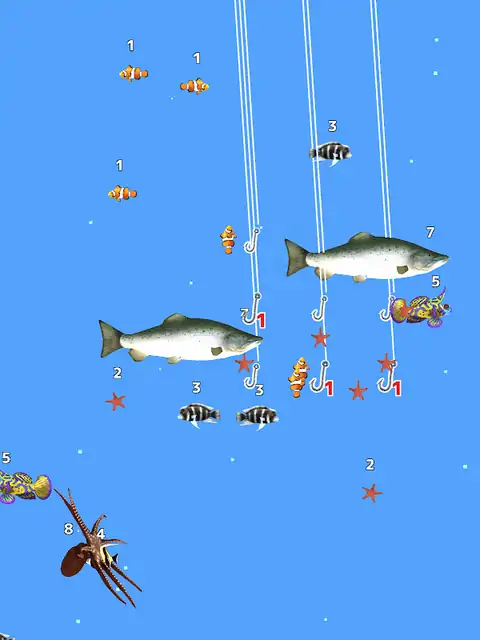 合并您的钓鱼竿并钓到很多鱼! 钓鱼并获得硬币以获取钓鱼竿。 你的钓竿越坚固,你可以钓到越大的鱼。 让我们钓到大鱼
