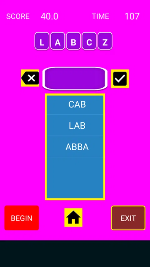 - 8个字即可晋级二级 - 12个字达到三级 - 15个字达到四级 - 20个字达到五级 - 30个字达到六级 - 您可以根据需要多次使用相同的字母。 - 接受的单词为 2-10 个字母。 - 不接受专有名词。 - 您可以选择游戏时间:120 秒或 180 秒。 单词通过一本包含超过130000个单词的优秀词典进行检查,并将不断更新。 该应用程序使用玩家姓名保存十个分数。 享受