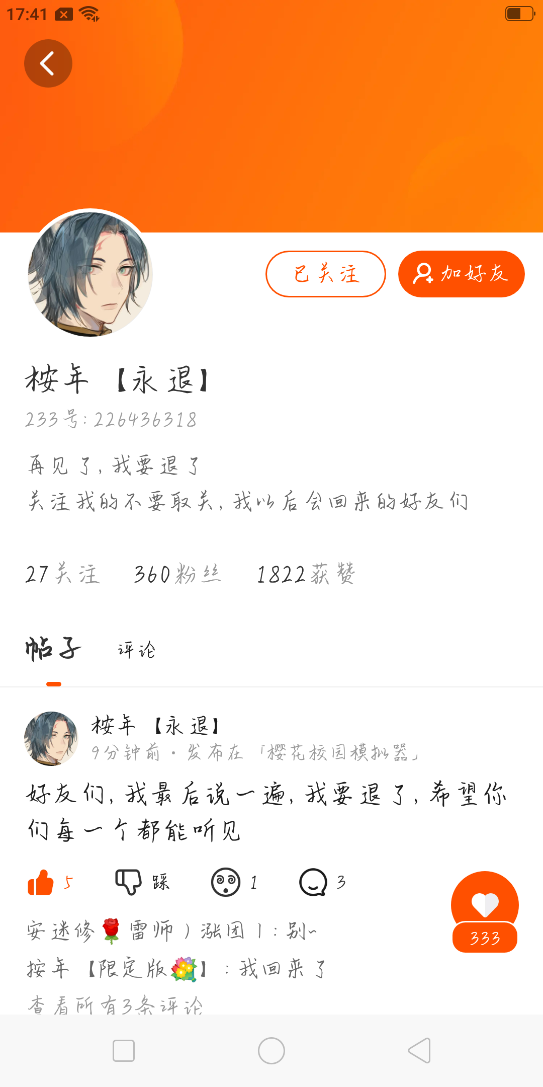 我又想起来了,我不再退了因为有可能我的粉丝也不在可能关注我了