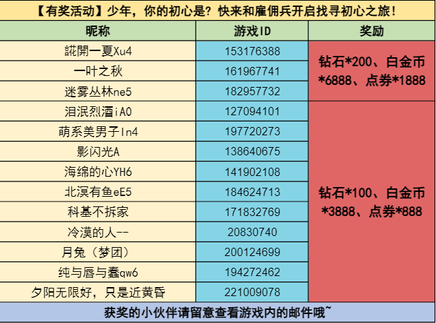 雇佣兵的年少初心(3名):钻石*200、点券*1888、白金币*6888