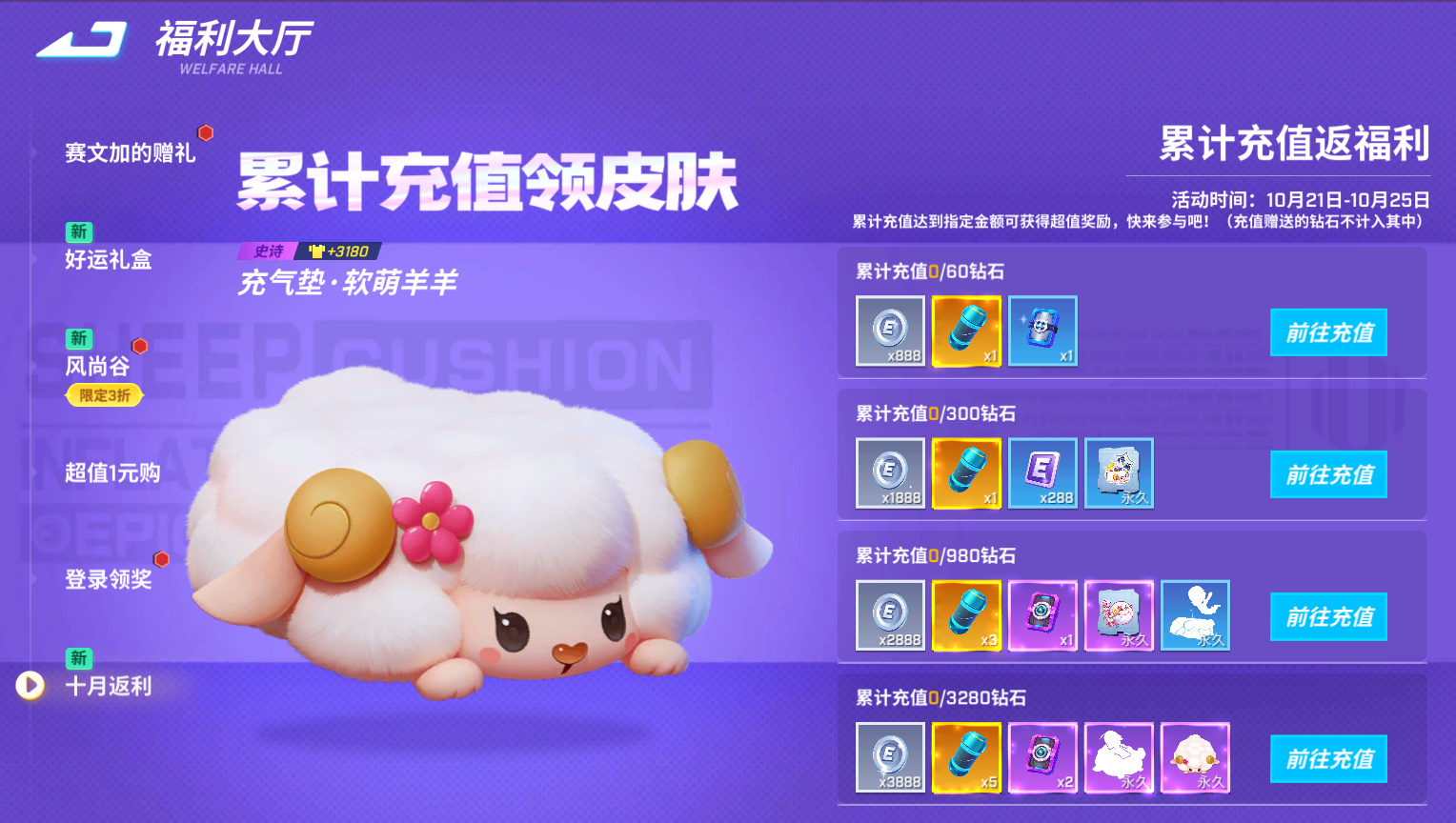 活动期间,累计充值达一定额度可获得永久道具卡皮肤【充气垫·软萌羊羊】以及限定涂鸦、灵感胶囊等丰富奖励!