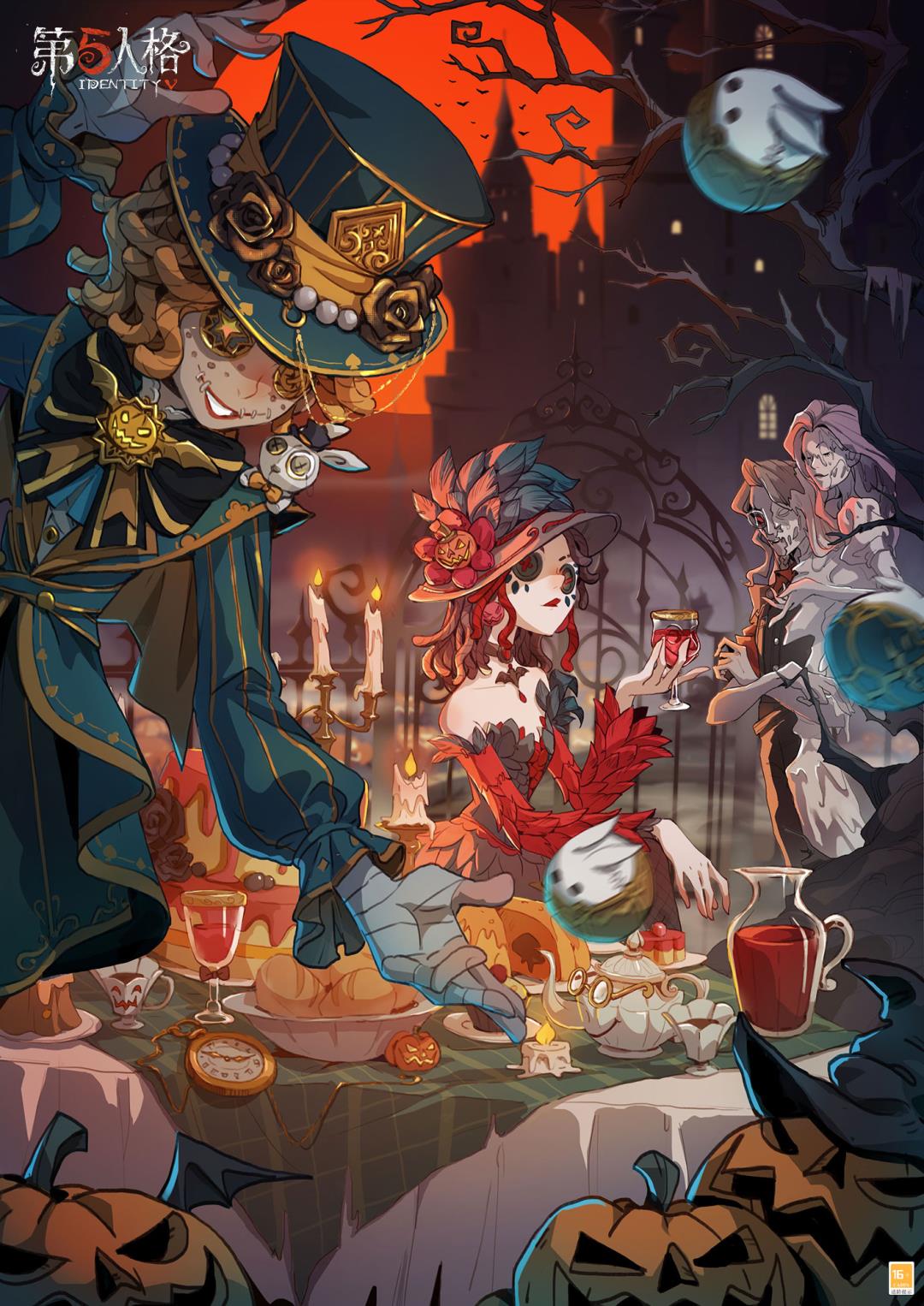 杂技演员-茶话会身着华丽的炫光材质风衣,从领口、袖口到衣摆、束腰都有着精巧的设计,高礼帽上的浮雕花纹和立体花饰倍显精致,足见他对晚宴和茶会的重视;胸口领结上的金色南瓜笑脸,高礼帽上的蝠翼装饰和身后的蝠翼形披风则有着浓厚的万圣节风情;几只小兔乖巧地配合着他的表演,小蝙蝠不断盘旋,拖出湛蓝色的尾迹,烘托出热烈的氛围。