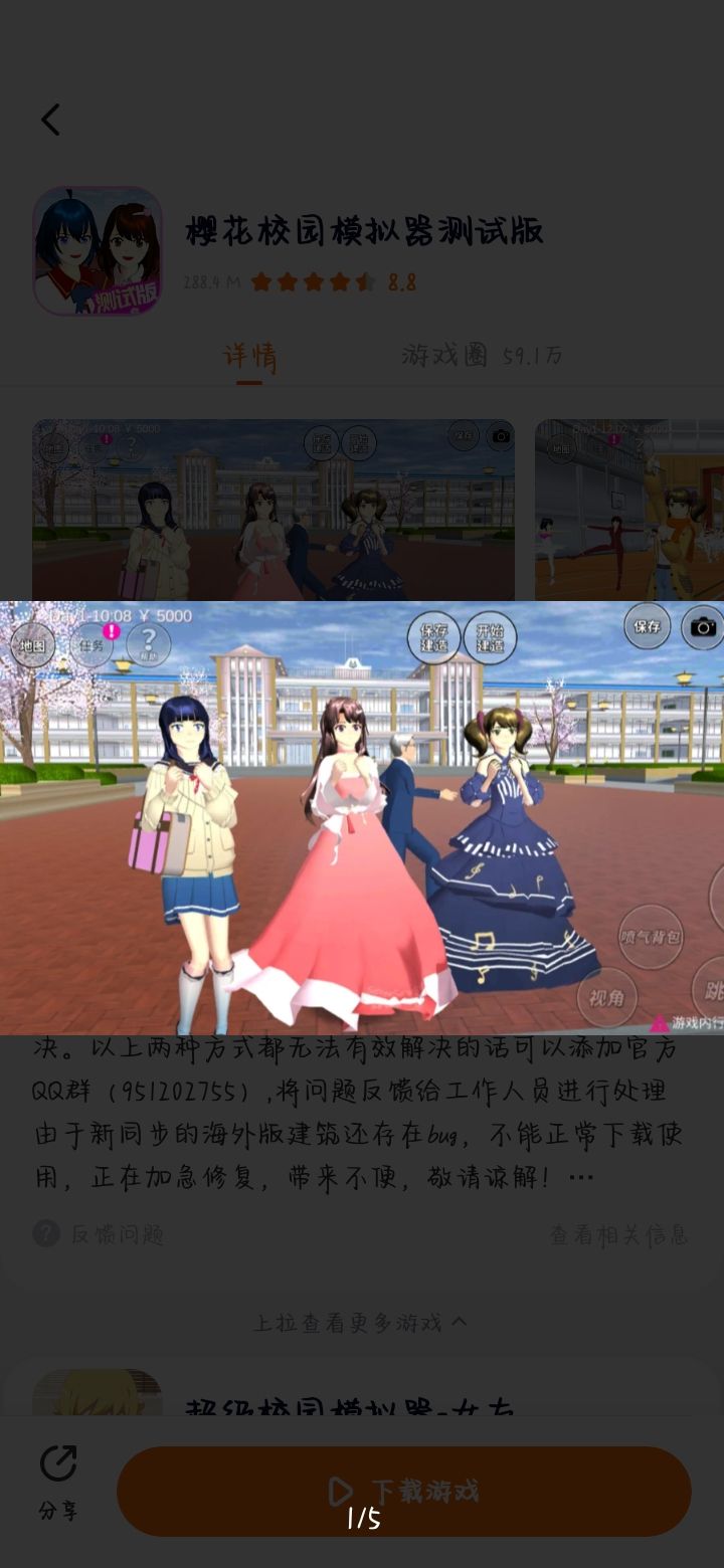 10月27日更新了万众期待的新动作版本,赶快带上你的小伙伴一起来体验新版本内容吧~ 注:如有遇到游戏打开后闪退的情况,请尝试关闭233乐园重新进入游戏或者更新到最新乐园版本,即可解决。以上两种方式都无法有效解决的话可以添加官方QQ群(951202755),将问题反馈给工作人员进行处理 由于新同步的海外版建筑还存在bug,不能正常下载使用,正在加急修复,带来不便,敬请谅解! 《樱花校园模拟器测试版》是一款非常有趣的校园女生模拟类的游戏,玩家们可以自由的扮演和自由的移动,触发游戏中的事项,达成更多的成就和剧情的通关,感兴趣的亲们赶紧下载吧! -----------开发者的话------------- 《樱花校园模拟器测试版》已正式引进中国并授权233乐园独家代理,玩家可享正版内容服务! 正版申明: 目前其他任何网站提供下载均为未授权的盗版,233乐园将保留追究侵权责任的权利!请玩家仔细辨别,以享受正版应用的权益,欢迎各位玩家积极举报盗版。