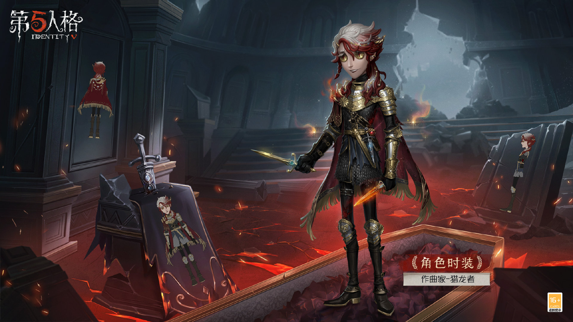 作曲家-猎龙者身披战甲和长袍,沉稳的黑色尽显坚实与厚重,耀眼的金色和银色展现尊贵与权力,鲜艳的红色印证猎龙的辉煌过往;双手各持一柄匕首,腰间还挂着一把匕首,曾亲历过史诗的它们,似乎已被某种力量所附着,绽放着危险的色泽;过肩长发一半殷红一半雪白,仿佛数百年前的双龙之战正在他体内上演;金色眼膜中的红色龙瞳、右肩上的金色龙爪、腰间的红色龙眸与龙鳞般的锁子甲则昭示着:古老传说中的庞大生物已经归来!