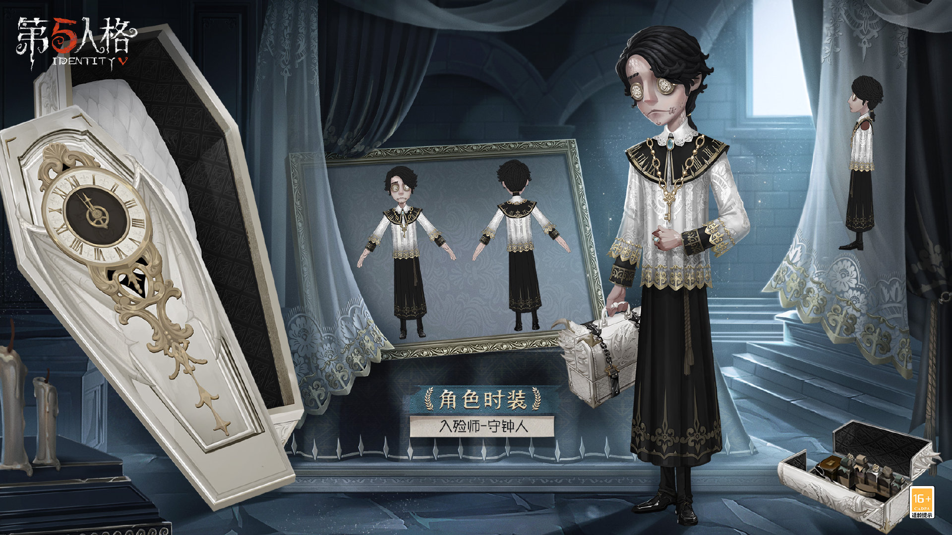 入殓师-守钟人是寂静之钟的守护者,他身穿黑色长袍,外罩白色纱衣,强烈的色彩对比视觉冲击感十足,长袍的裙摆上绣有指针样式的花纹,纱衣上满是细腻的镂空刺绣,披肩上的绘有罗马文字,如同时钟的表盘;胸前的金色钥匙可以开启神秘的枷锁,披肩扣和戒指上的宝石光泽耀目,右手的白色箱子上雕刻了巨龙形象,几根利爪刺破箱体,努力地想挣脱束缚;白色棺盖上的金色时钟里,两根指针即将重叠,发出骇世的钟声,再现巨龙的纷争。