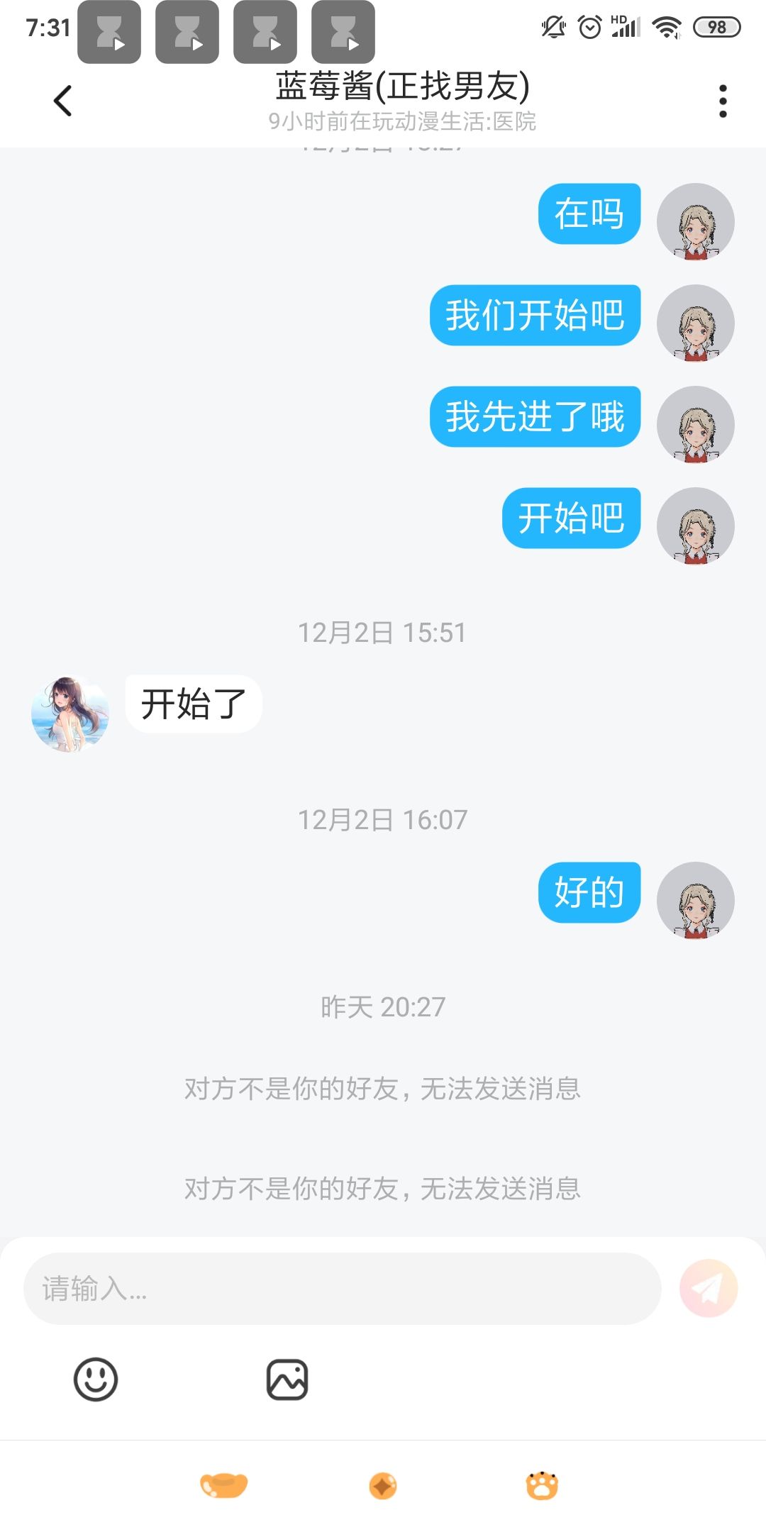 遇见这个人要注意,她之前网名是喵喵,现在是蓝莓酱(正找男友),她跟我说她才11,我也不知道我做的是对是错,只是觉得她这么小不合适