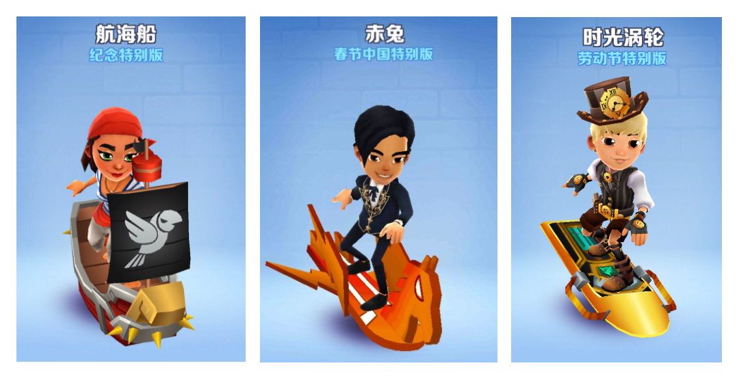 第一套:洛奇的机械手表(开滑板时增加10倍得分),嫦娥小月兔(飞天后速度更快),卷卷金色耳环(手动触发双倍得分)