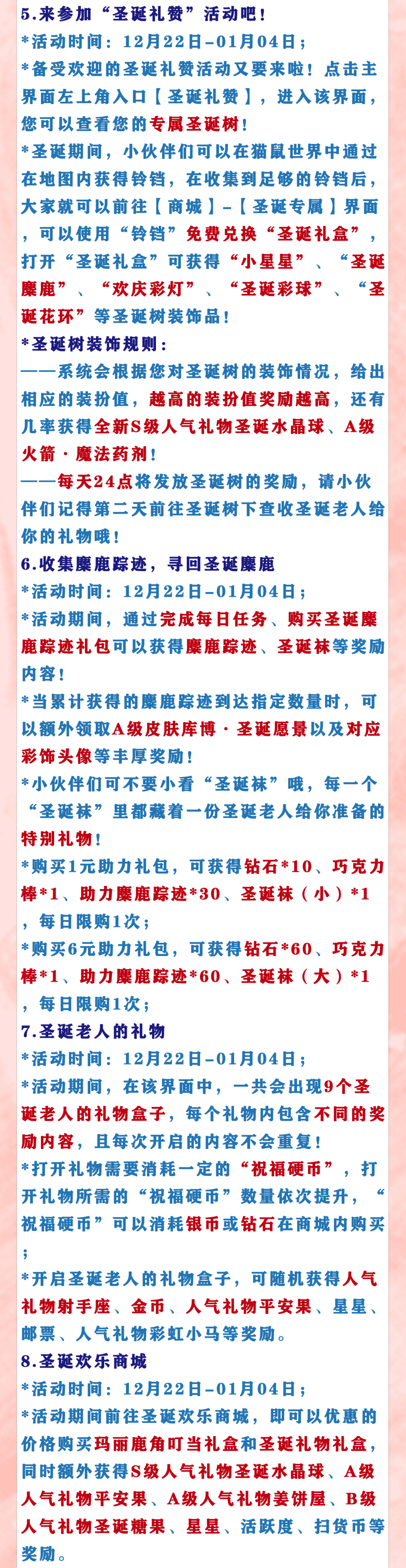*活动期间前往圣诞欢乐商城,即可以优惠的价格购买玛丽鹿角叮当礼盒和圣诞礼物礼盒,同时额外获得S级人气礼物圣诞水晶球、A级人气礼物平安果、A级人气礼物姜饼屋、B级人气礼物圣诞糖果、星星、活跃度、扫货币等奖励。