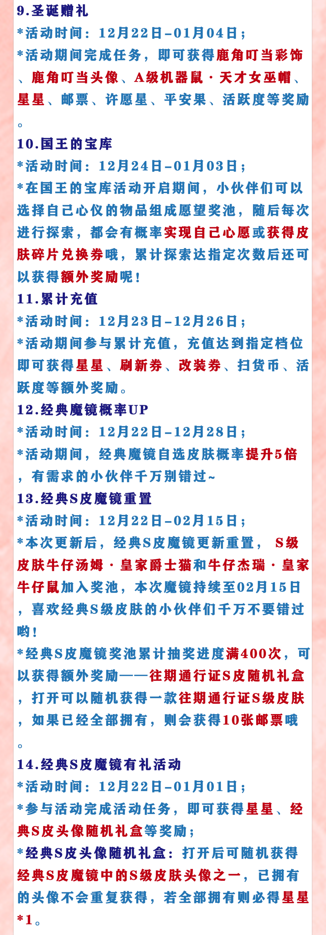 *穿着以下圣诞系列皮肤在天梯赛、匹配赛玩法中参与比赛,捡拾获得的铃铛数将获得50%加成(不影响每日可捡拾上限);