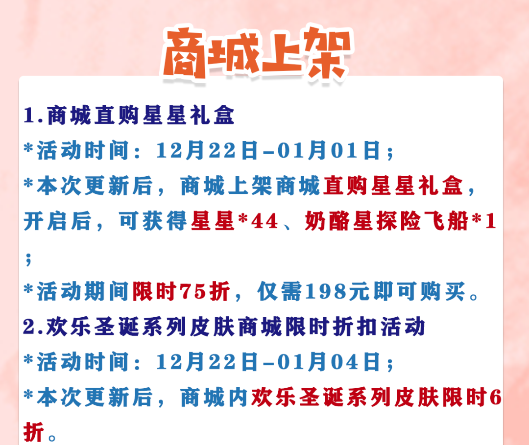 *本次更新后,商城上架商城直购星星礼盒,开启后,可获得星星*44、奶酪星探险飞船*1;