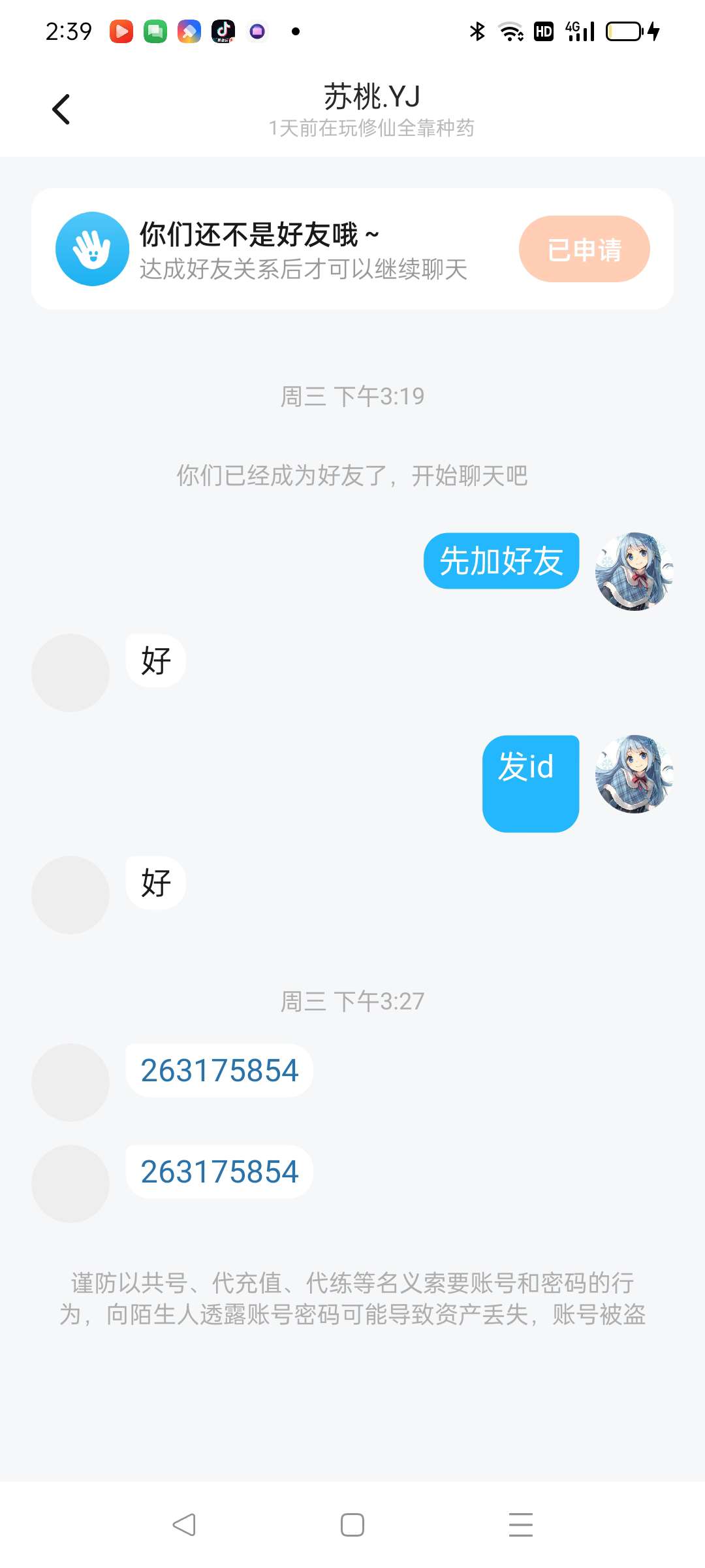 避雷这个人,玩我号删我好友,我让它不要花点券10000多都没有了,还搞禁言了,还天天加煌瑟的好友