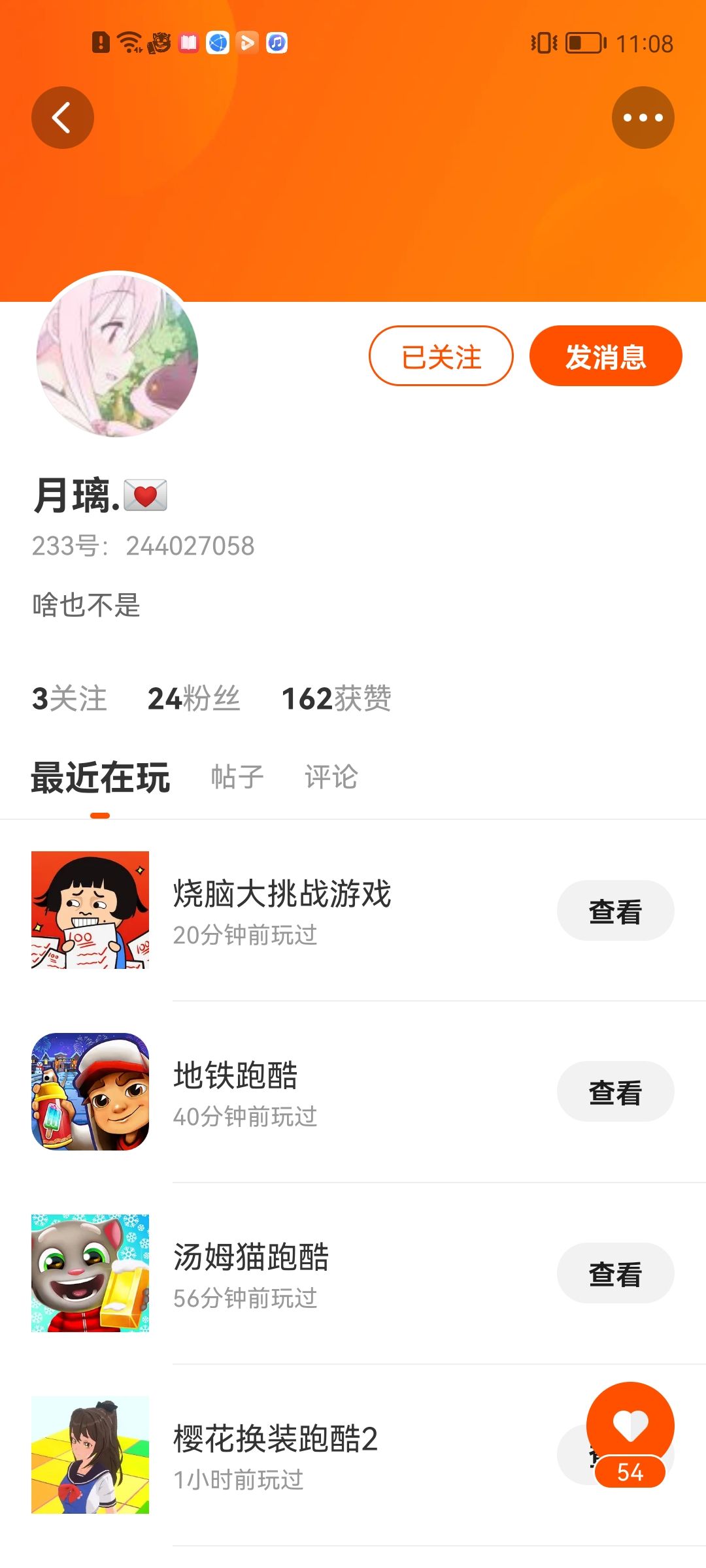 月璃jj居然也玩233,而且她还回关我了