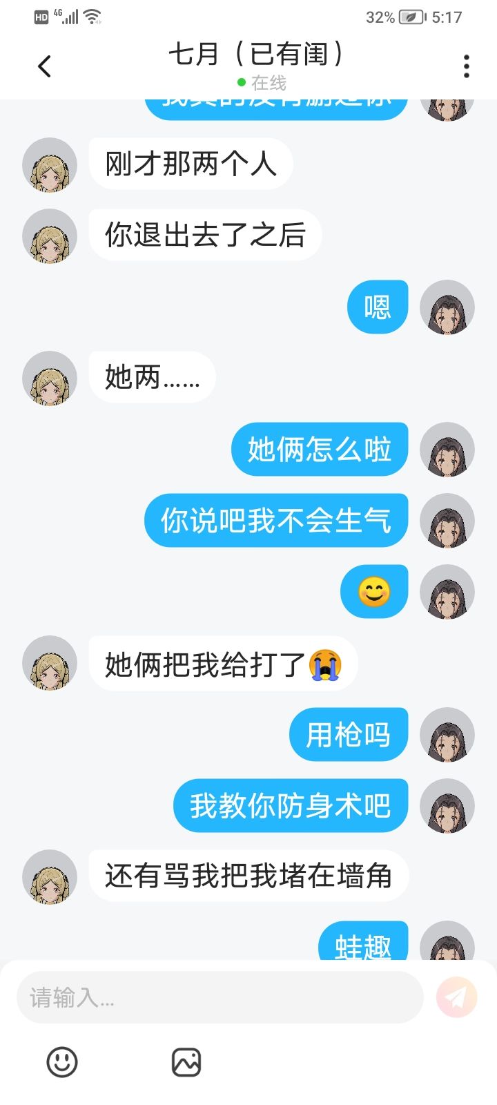 我和我闺宝一起玩夏日海岛,有两个人用的闺蜜装,一个叫小狐狸,它和它闺蜜一直进我和我闺宝的房间,我就骂它们,把它们骂走了,然后它们又来,我拿着枪追它们,后面我去🛀🏻了,就退出了,我闺宝是这么和我说的:那两个人在我退出之后打了她,还把她堵在墙角骂,她退到初始点,她两个人也去初始点继续骂她