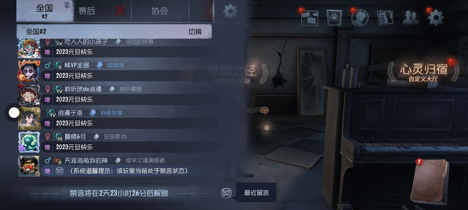 劝第五官方,赶快给我把禁言解除了,我是个无辜的人,在那跟朋友组队聊天,都能被禁言,整的人家都不敢说话了以后╮(﹀_﹀)╭